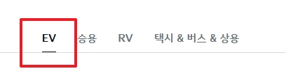2. 상단 메뉴에서 ‘차량’을 클릭하여 전반적인 차량 목록을 확인합니다. 페이지가 이동하면 여러 카테고리 메뉴가 나타나는데, 전기차를 확인하기 위해 ‘EV’ 항목을 클릭합니다. EV 메뉴로 이동하면 기아의 전기차 라인업이 한눈에 보여 다양한 모델의 가격과 주요 사양을 비교할 수 있습니다.