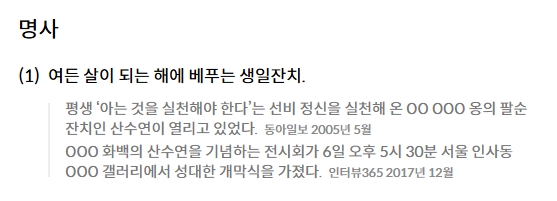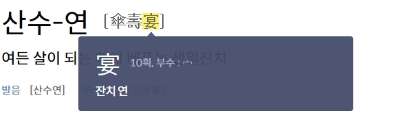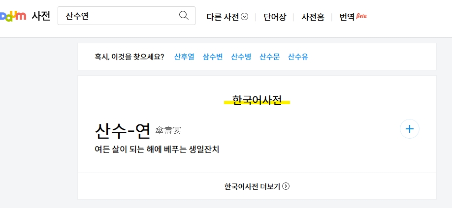 2. 검색창에 산수연을 입력하여 검색합니다. 검색 결과로 산수연의 뜻이 표시됩니다. 산수연은 여든 살이 되는 해에 베푸는 생일 잔치를 의미하며, 전통적으로 장수를 축하하고 경축하는 중요한 행사로 여겨집니다. 이는 한국 사회에서 나이를 기념하는 대표적인 잔치 문화 중 하나입니다.