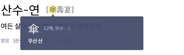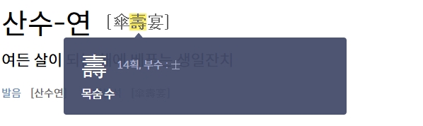 3. 산수연의 한자 풀이를 확인합니다. 산수연은 한자 傘壽宴으로 구성되어 있습니다. 傘는 우산을 의미하며 여든을 상징합니다. 壽는 목숨이나 장수를 의미하며 생명을 기리고 축하하는 뜻을 담고 있습니다. 宴은 잔치를 뜻하며 기념하거나 축하하기 위해 열리는 행사를 나타냅니다. 이 세 글자가 결합하여 산수연은 여든 살의 생일을 축하하는 잔치를 뜻합니다.