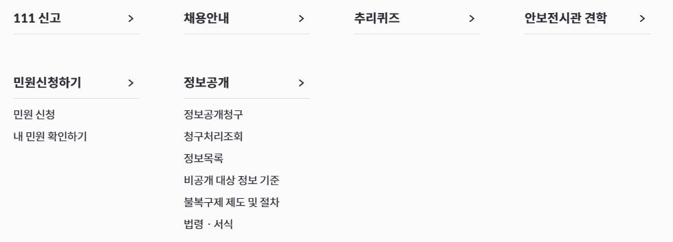 6. 111 신고 메뉴를 통해 국가의 안보에 기여할 수 있는 방법을 확인합니다. 111 신고는 국가의 안전을 위협하는 사안에 대해 국민이 직접 신고할 수 있는 서비스입니다. 이를 통해 국민과 정부가 협력하여 국가 안전을 강화하는 데 기여할 수 있습니다. 신고 방법과 절차는 홈페이지에서 상세히 안내됩니다.