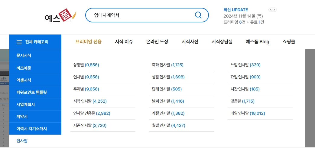 1. 예스폼 홈페이지로 접속합니다. 예스폼은 다양한 문서, 엑셀 서식, 비즈니스 예문, 자기소개서 등을 제공하는 플랫폼으로, 사용자가 필요한 서식을 빠르게 다운로드할 수 있습니다. 축하 인사말, 비즈니스 문구 등 다양한 상황에 맞는 문구를 검색하고 활용할 수 있는 서비스를 제공합니다.