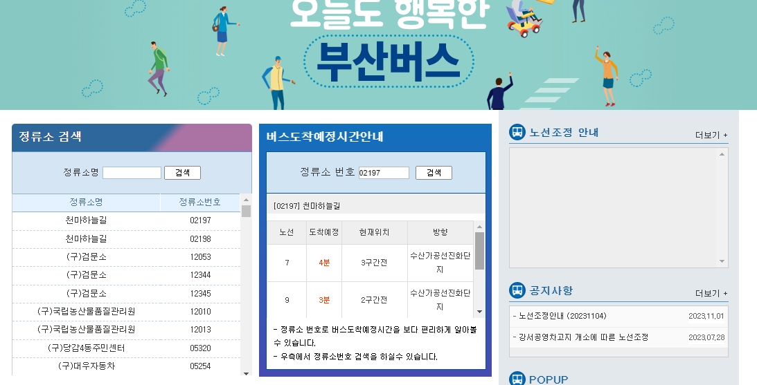 정류소 검색을 이용해 부산역을 검색하면, 여러 정류소가 나타납니다. 사람들이 하나를 선택하면, 해당 정류소에서 버스 도착 예정 시간을 확인할 수 있습니다.