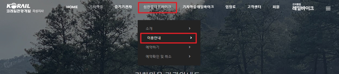 메뉴 화면 상단에서 섬진강레일바이크를 클릭한 뒤, 하위 이용안내 메뉴로 진입하면 운행시간표부터 요금, 예약 절차까지 한눈에 확인할 수 있습니다.