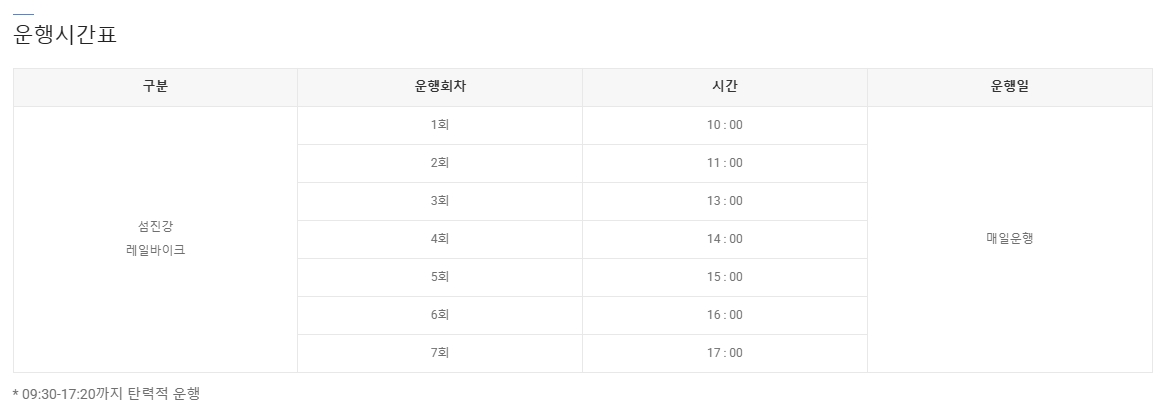 운행시간표운행시간표운행시간표에 따르면 섬진강 레일바이크는 오전 10시부터 오후 5시까지 총 7회 매일 운행하며, 09:30~17:20 구간은 탄력적으로 출발이 가능합니다. 예약 시 출발 시간을 꼭 확인하세요.