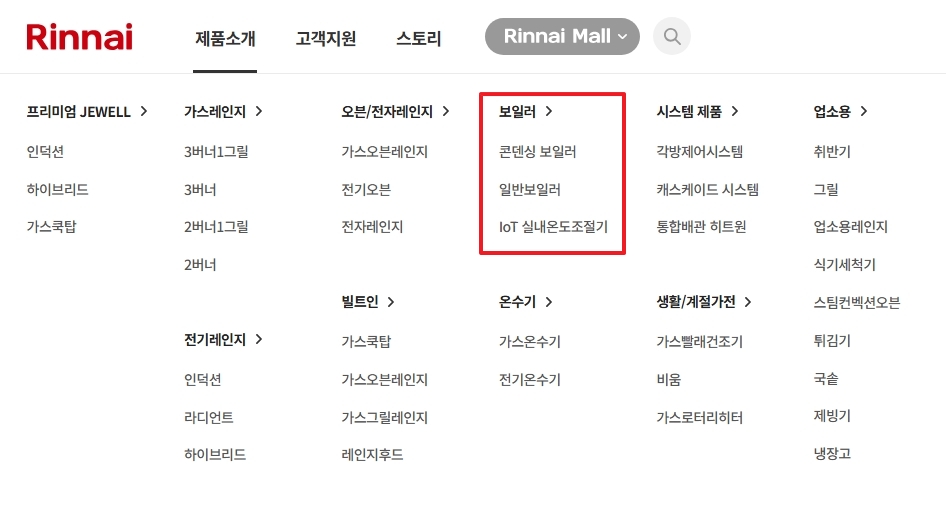 2. 상단 메뉴에서 제품소개 항목을 선택하고 보일러 카테고리를 클릭하세요. 이 섹션에서는 린나이에서 제공하는 다양한 보일러 제품들이 정리되어 있으며, 각 제품의 특성과 사용법을 한눈에 확인할 수 있습니다. 이 중 본인이 사용 중인 보일러를 찾아보세요.