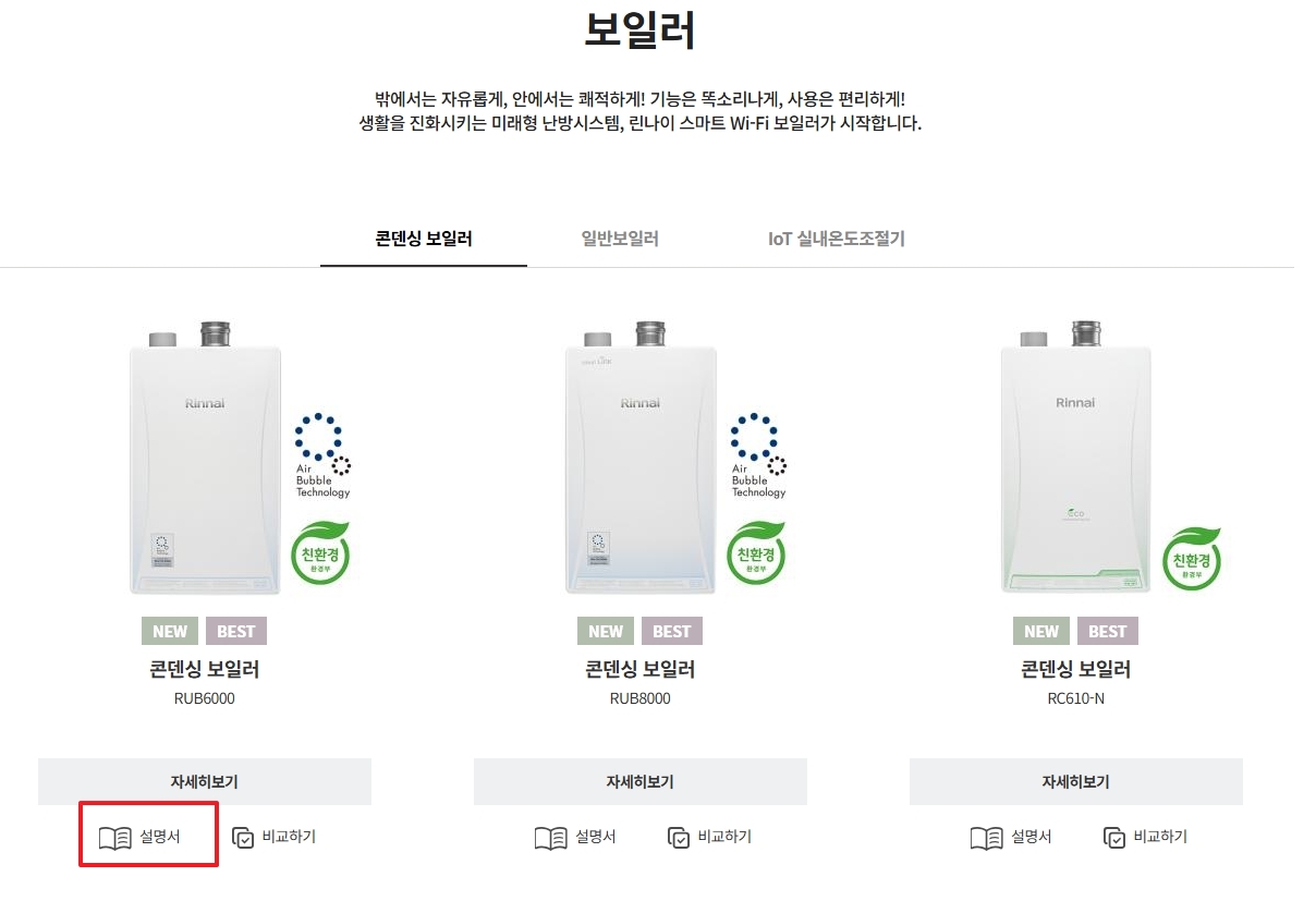 3. 본인의 보일러 모델을 찾는 과정에서, 모든 보일러 모델이 비슷한 사용법을 가지기 때문에 반드시 동일한 모델을 찾을 필요는 없습니다. 비슷한 기능을 가진 모델을 선택해도 충분히 유용한 정보를 얻을 수 있습니다. 원하는 모델을 선택한 뒤 설명서 항목을 클릭하면 세부적인 사용법이 나타납니다.