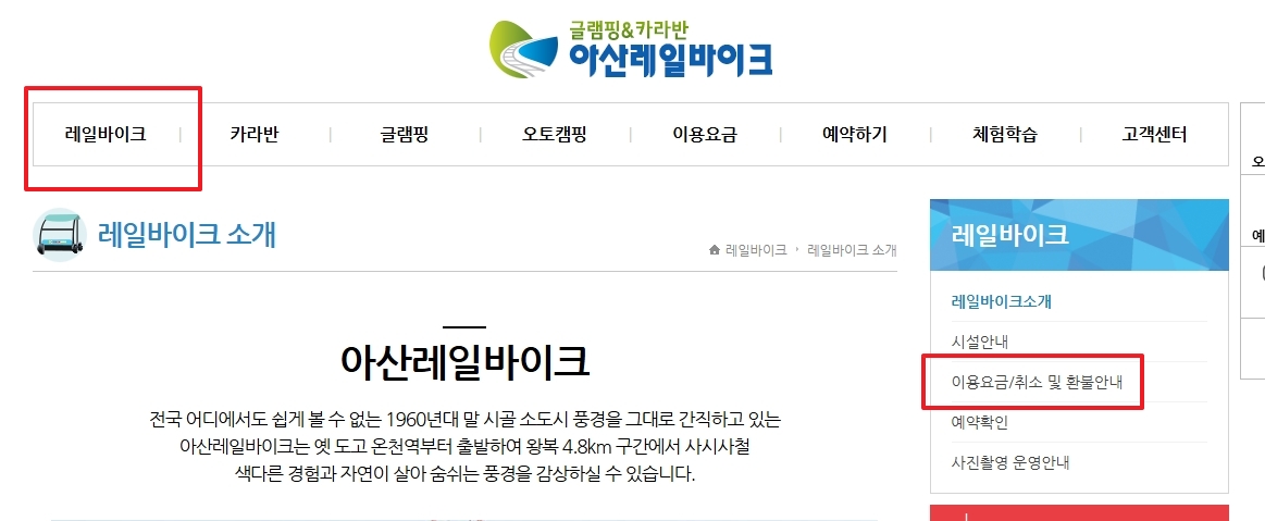 해당 웹사이트 최상단 메뉴에서 레일바이크를 선택한 뒤, 우측 사이드바의 이용요금/취소 및 환불안내를 클릭하면 아산레일바이크의 운영 구간인 옛 온천역 출발 왕복 4.8km 구간 정보와 요금·환불 정책을 확인할 수 있습니다.