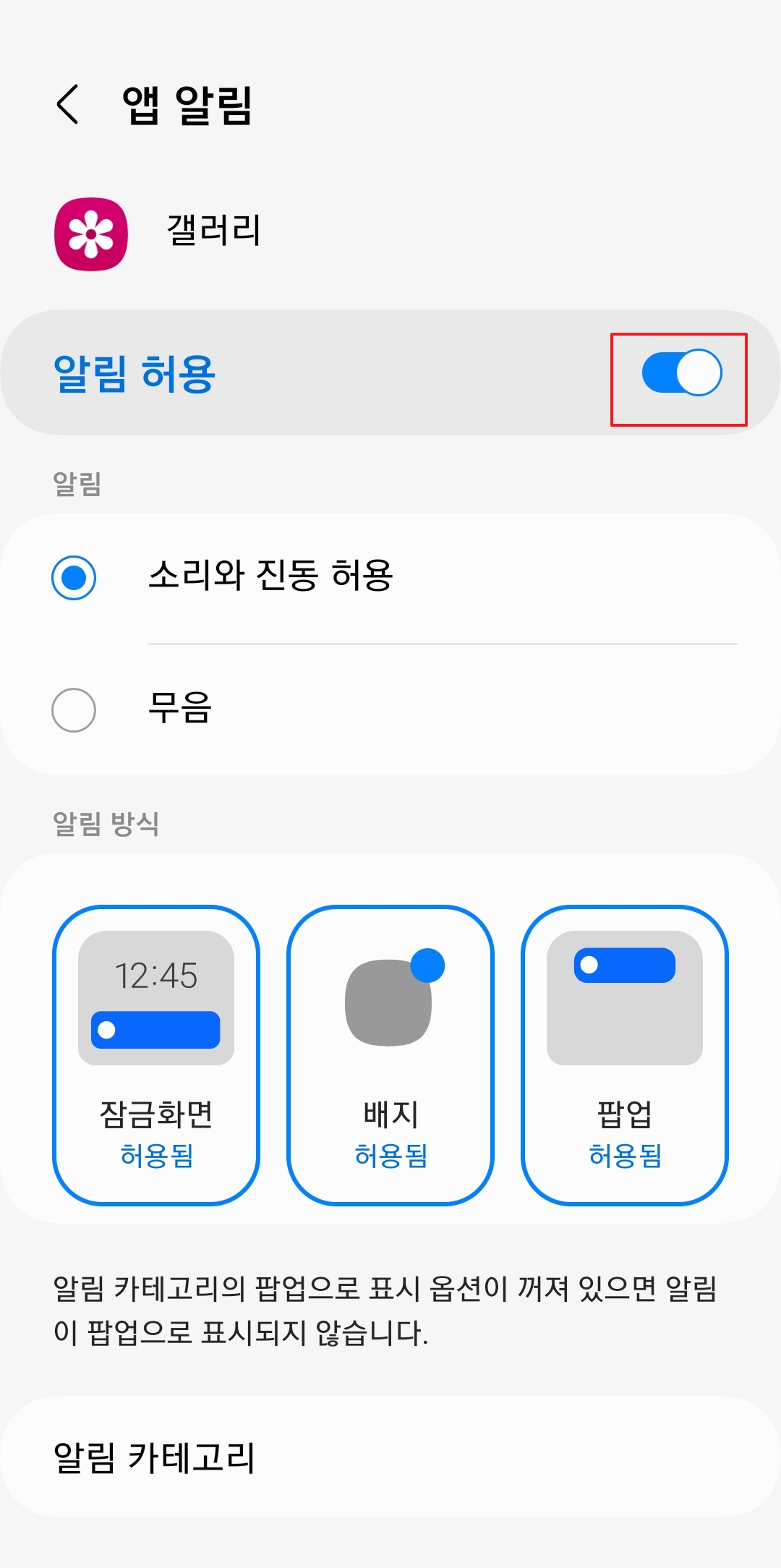 5. 원하는 어플을 선택하고, 알림 허용 여부를 조정하세요. 알림을 끌 경우 해당 어플의 모든 알림이 차단됩니다. 또한, 소리, 진동, 팝업, 잠금 화면 표시 등 세부 옵션도 각각 조정할 수 있습니다.