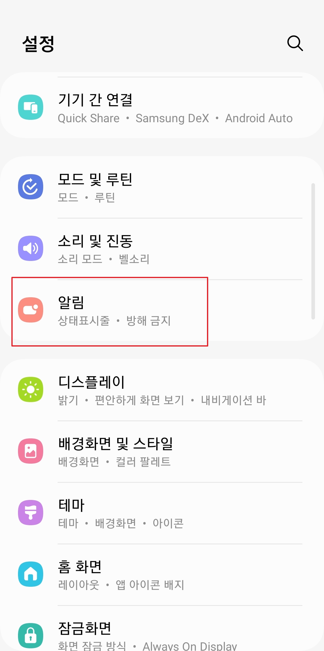 2. 설정 화면에서 아래로 스크롤하여 알림 메뉴를 찾으세요. 이 메뉴는 모든 어플의 알림 설정을 관리할 수 있는 곳입니다. 알림 메뉴를 클릭하면 일반적인 알림 옵션과 함께 어플별 세부 알림 설정을 조정할 수 있는 화면으로 이동합니다.