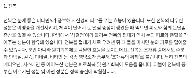 3. 전복은 눈 건강에 좋은 대표적인 음식으로, 비타민 A가 풍부해 시신경 피로를 풀어주는 효과를 가지고 있습니다. 타우린 성분은 눈의 충혈을 막아주며, 체내 활력을 높이는 데에도 도움을 줍니다. 전복을 찌거나 끓여 먹으면 그 영양소가 더욱 잘 흡수됩니다. 이 외에도 전복은 칼슘, 미네랄, 비타민 등 다양한 영양소가 풍부하여 원기 회복에 탁월한 효과를 보입니다.