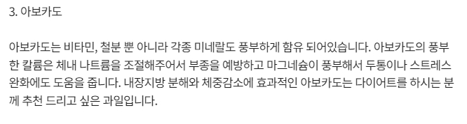 5. 아보카도는 비타민과 미네랄이 풍부하게 함유된 과일로, 특히 마그네슘과 칼륨 함량이 높아 눈 떨림 예방에 효과적입니다. 아보카도의 풍부한 불포화지방산은 나트륨 배출을 도와 혈압 조절에 기여하며, 스트레스 완화와 체중 감량에도 도움을 줍니다. 아보카도는 내장지방 분해에 효과적이며, 다이어트를 시도하는 사람들에게 매우 유익한 선택입니다.