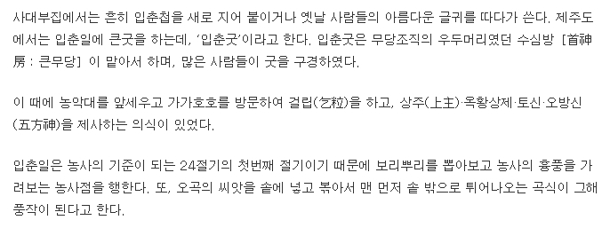 5. 입춘첩 외에도 가정에서는 입춘날을 맞아 집 안을 청소하고, 가족과 함께 입춘절식(立春節食)을 먹으며 한 해의 건강과 풍요를 기원했습니다. 특히, 농촌에서는 보리뿌리를 뽑아 농사의 시작을 알리는 의례를 거행하거나, 공동체가 함께 모여 입춘제를 올리며 농사의 성공과 마을의 화합을 기원하는 행사가 열렸습니다.