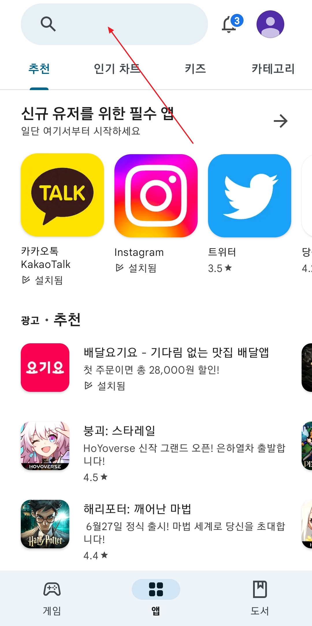 2. 플레이스토어 화면 상단에 위치한 돋보기 모양의 검색창을 찾아 클릭합니다. 검색창은 앱 이름이나 키워드를 입력할 수 있는 곳으로, 새로운 앱을 찾는 가장 빠른 방법입니다. 검색창을 터치하면 키보드가 자동으로 활성화되며, 입력할 준비가 됩니다. 검색창은 화면에서 가장 눈에 잘 띄는 위치에 있어서 쉽게 찾을 수 있지만, 만약 보이지 않는다면 앱을 스크롤하여 상단으로 이동하면 됩니다. 이 검색 기능은 단순히 앱 이름뿐 아니라 관련된 키워드로도 결과를 찾을 수 있어 매우 유용합니다.