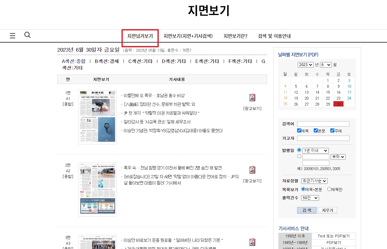 이번에는 상단 메뉴의 ‘지면 넘겨 보기’를 클릭해봅니다. 이 기능은 사용자가 디지털화된 신문을 한 장씩 넘겨볼 수 있도록 설계된 기능으로, 종이 신문과 유사한 사용자 경험을 제공합니다.