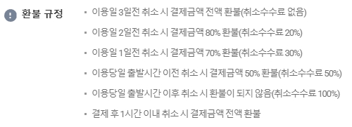 환불 규정에서는 이용일 기준 3일 전 취소 시 결제금액 전액 환불(수수료 없음), 2일 전 취소 시 80% 환불, 1일 전 취소 시 70% 환불, 당일 출발 전 취소 시 50% 환불, 출발 후 취소 시 환불 불가(수수료 100%), 결제 후 1시간 이내 취소 시 전액 환불 등 세부 기준을 제시하여 이용객의 권리를 보호합니다.