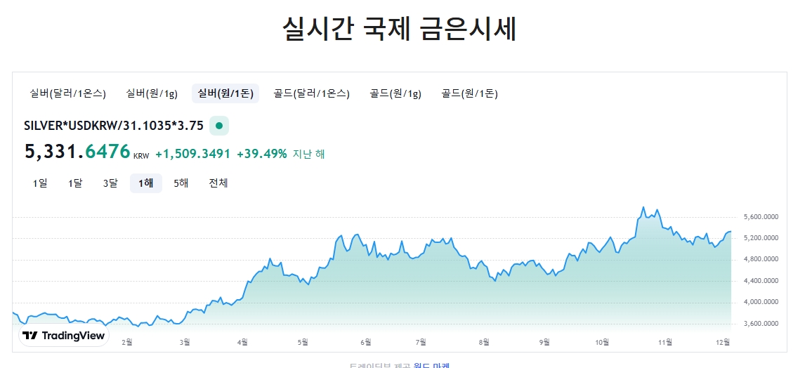 4. 은 시세를 1톤 단위로 환산한 가격은 5,331,647.6원입니다. 이는 대량 구매나 산업용 은의 거래에서 참고할 수 있는 데이터로, 대규모 거래자들에게 적합한 정보를 제공합니다. 그래프에서는 대량 거래 시 유리한 시기를 판단할 수 있도록 과거와 현재의 변동 추이를 명확히 보여줍니다.