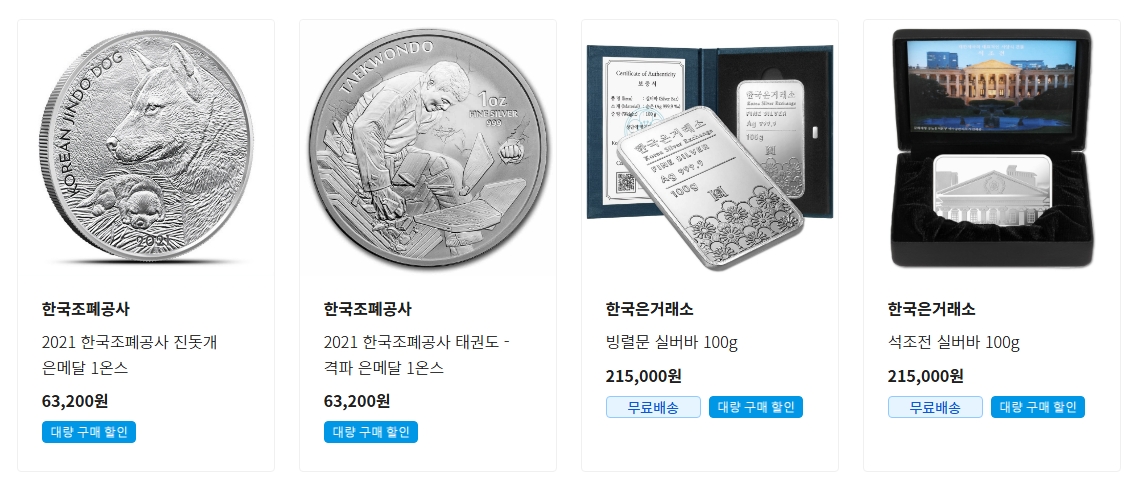 5. 은 제품을 구매하려는 투자자를 위해 다양한 디자인의 은화와 은바가 소개됩니다. 예를 들어, 한국조폐공사의 2021 진돗개 은메달과 2021 태권도 은메달은 각각 63,200원에 판매되고 있습니다. 이와 함께 100g 실버바와 같은 투자형 제품도 215,000원으로 제공되며, 대량 구매 시 할인이 적용됩니다.