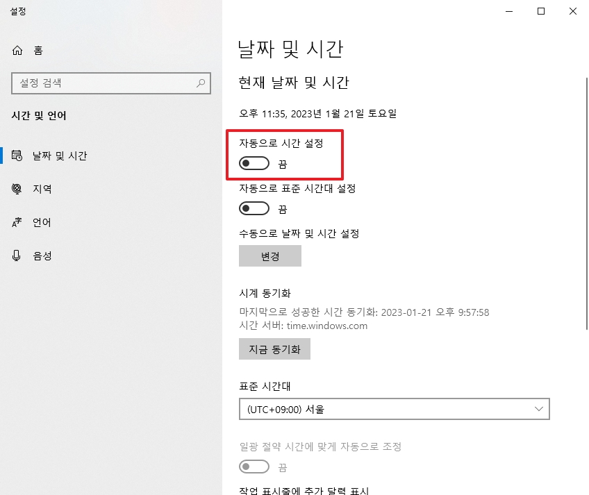 시간 자동 설정이 켜져 있는데도 시간이 맞지 않다면, 인터넷 시간 서버와의 동기화 문제일 가능성이 있습니다. 같은 메뉴에서 인터넷 시간 탭으로 이동한 뒤, 설정 변경을 클릭해 동기화 서버를 확인합니다. 기본값은 보통 `time.windows.com`으로 설정되어 있지만, 이 서버에 문제가 있을 경우 다른 서버(예: `pool.ntp.org`)로 변경해 다시 동기화를 시도하면 해결될 수 있습니다.