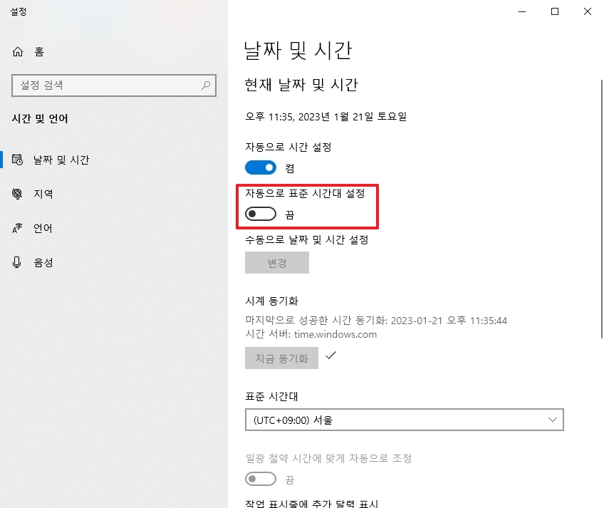 5. 자동으로 표준 시간대 설정은 기본적으로 비활성화되어 있습니다. 필요에 따라 활성화할 수 있으며, 주로 시간을 기준으로 자동으로 시간대를 변경해야 할 때 유용합니다. 하지만 대부분의 경우 기본 상태를 유지해도 문제가 없습니다.