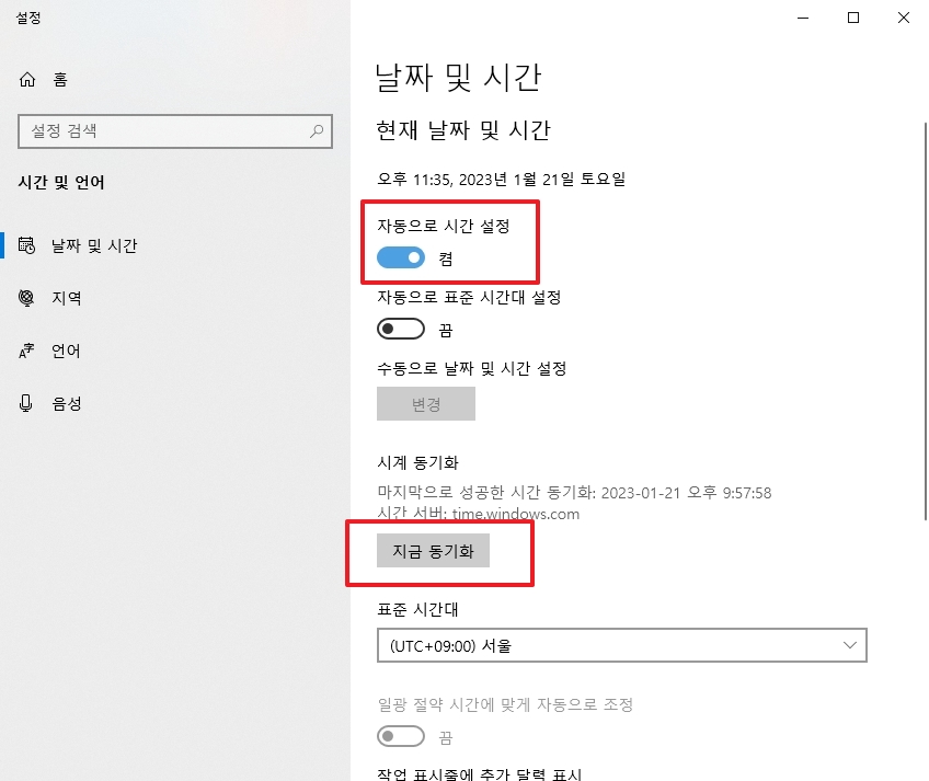4. 지금 동기화 버튼을 눌러 현재 컴퓨터 시간을 서버 시간과 즉시 동기화합니다. 이 과정을 통해 휴대폰이나 네이버 시계와 동일한 시간을 확인할 수 있습니다.