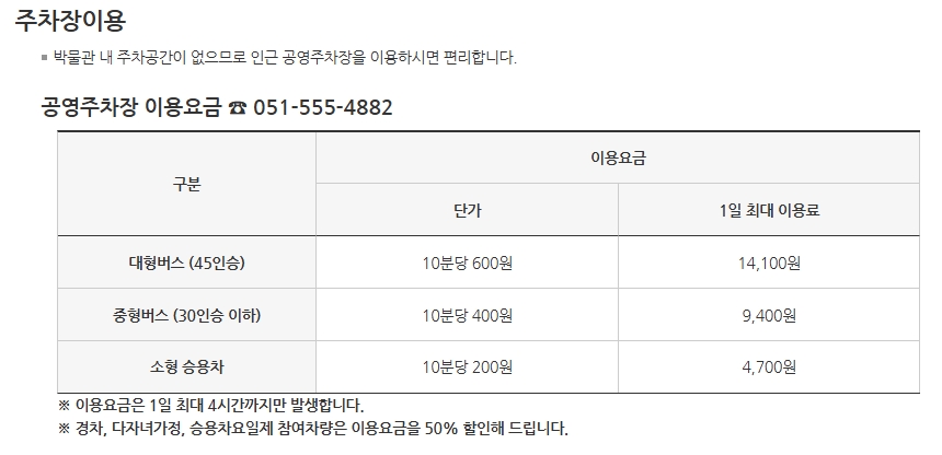 박물관은 자체 주차장이 없어 인근 공영주차장을 이용해야 하며, 주차 공간이 제한적이므로 가급적 대중교통 이용을 권장합니다. 요금은 대형버스 10분당 600원, 중형버스 10분당 400원, 소형 승용차 10분당 200원이며, 1일 최대 요금은 각각 대형버스 14,100원, 중형버스 9,400원, 소형 승용차 4,700원입니다.