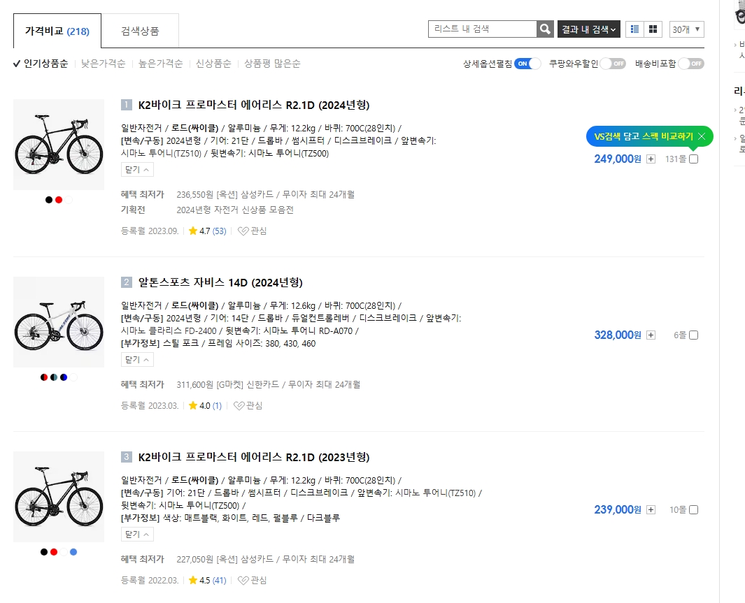 4. 인기순 정렬을 선택하면 사용자들 사이에서 가장 많이 검색되고 구매된 로드 자전거 브랜드와 모델을 확인할 수 있습니다. 이를 통해 트렌드에 맞는 인기 제품을 쉽게 찾을 수 있습니다.