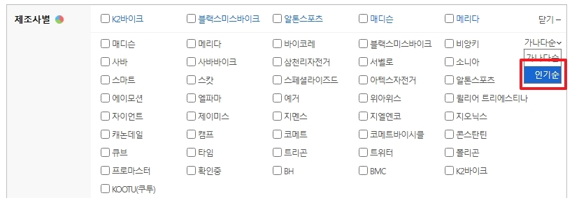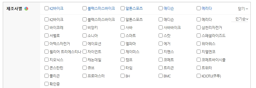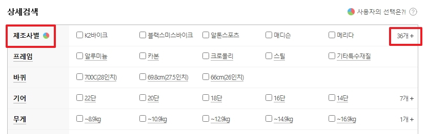 3. 상세 검색 옵션에서 제조사별을 선택하면 다양한 브랜드가 표시됩니다. 여기에서 K2바이크, 알톤스포츠, 메리다, 스페셜라이즈드 등 주요 로드 자전거 제조사를 선택하여 비교할 수 있습니다.
