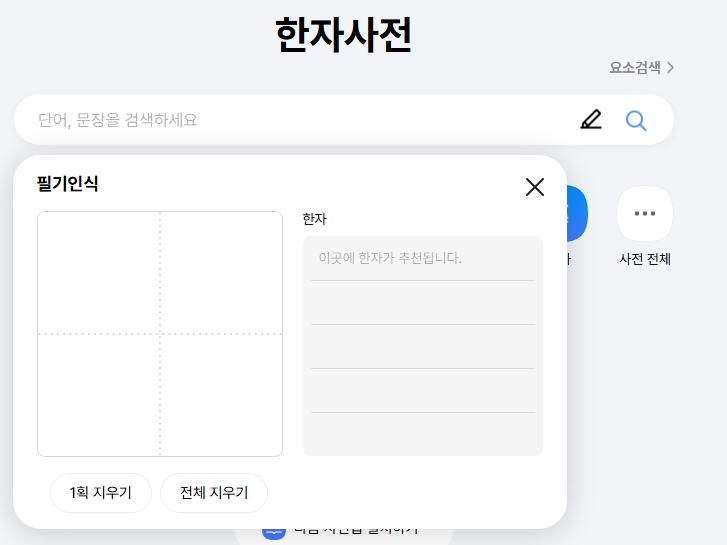 3. 검색창 외에도 연필 모양의 버튼을 누르면 필기 인식 기능을 사용할 수 있습니다. 이 기능은 한자를 직접 그려서 입력할 수 있도록 돕는 도구입니다. 사용자가 정확한 한자를 모르거나 발음을 모를 경우, 한자의 모양만 기억하고 있다면 이를 직접 그려 넣어 검색할 수 있습니다. 필기 인식은 직관적이며, 한자 모양을 그릴 때 인식률도 높아 다양한 한자를 쉽게 찾을 수 있는 장점이 있습니다.
