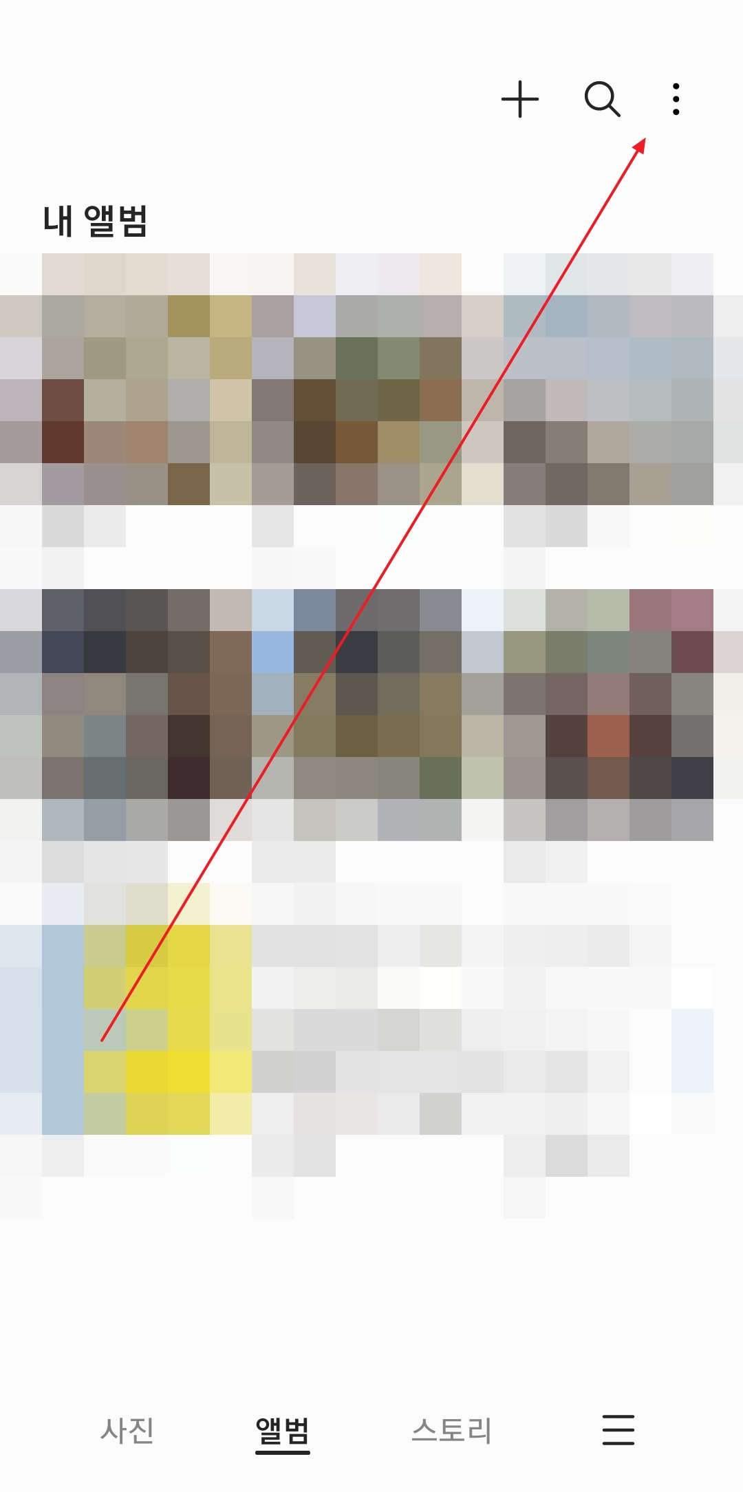 1. 핸드폰에서 갤러리 앱을 실행합니다. 갤러리가 열리면 화면의 우측 상단에 있는 점 세 개 아이콘(메뉴 버튼)을 클릭합니다. 이 버튼을 통해 추가 설정 옵션에 접근할 수 있습니다.