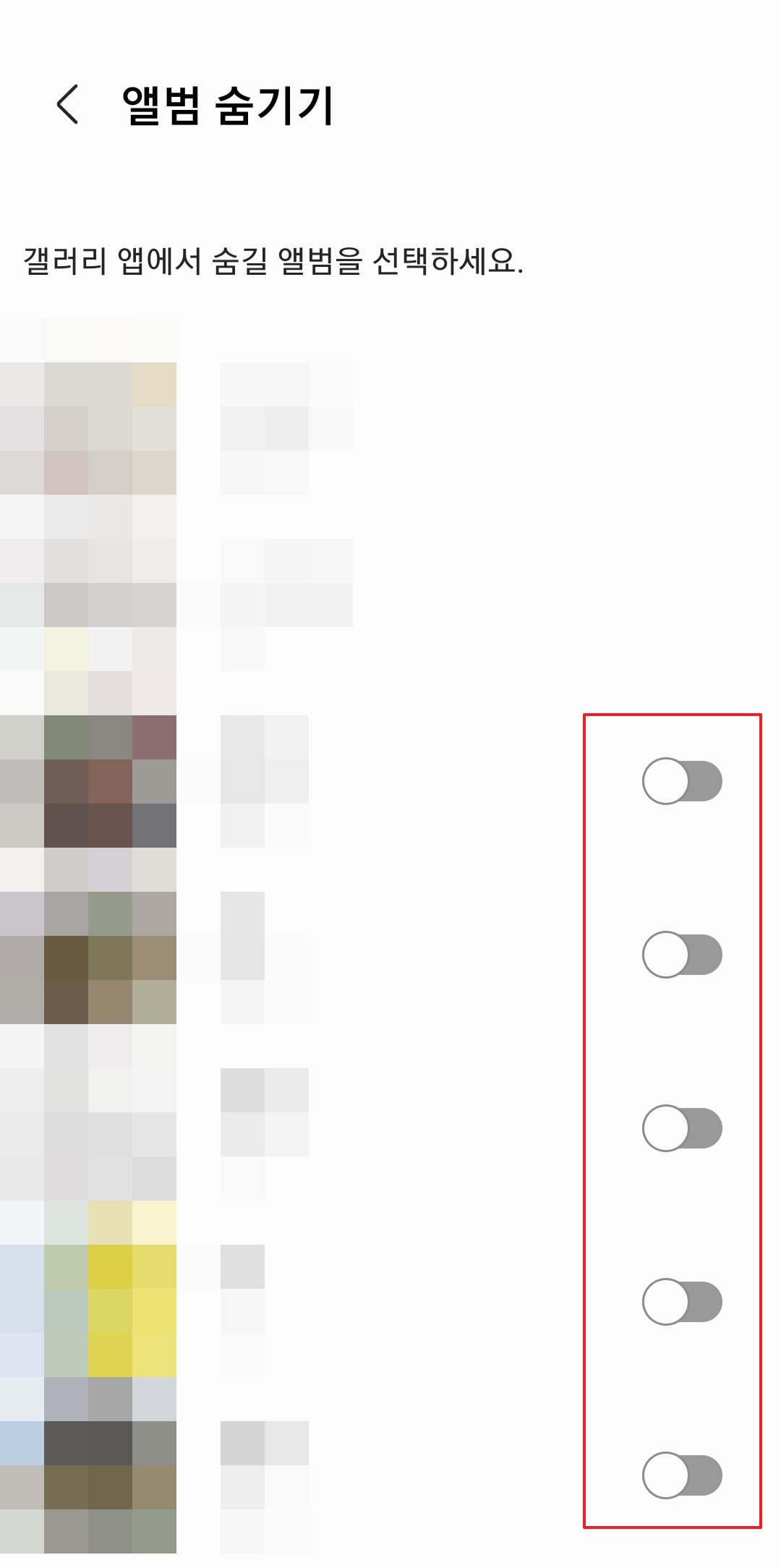 3. 앨범 숨기기 설정 화면에서는 갤러리에 있는 폴더 목록이 표시됩니다. 기본 갤러리에서 제공되는 폴더(예: 카메라, 스크린샷 등)는 숨기기가 불가능하지만, 사용자가 직접 생성한 폴더는 숨기기가 가능합니다. 숨기고 싶은 폴더의 옆에 있는 ON/OFF 버튼을 켜거나 꺼서 숨기기 기능을 활성화하거나 해제할 수 있습니다.