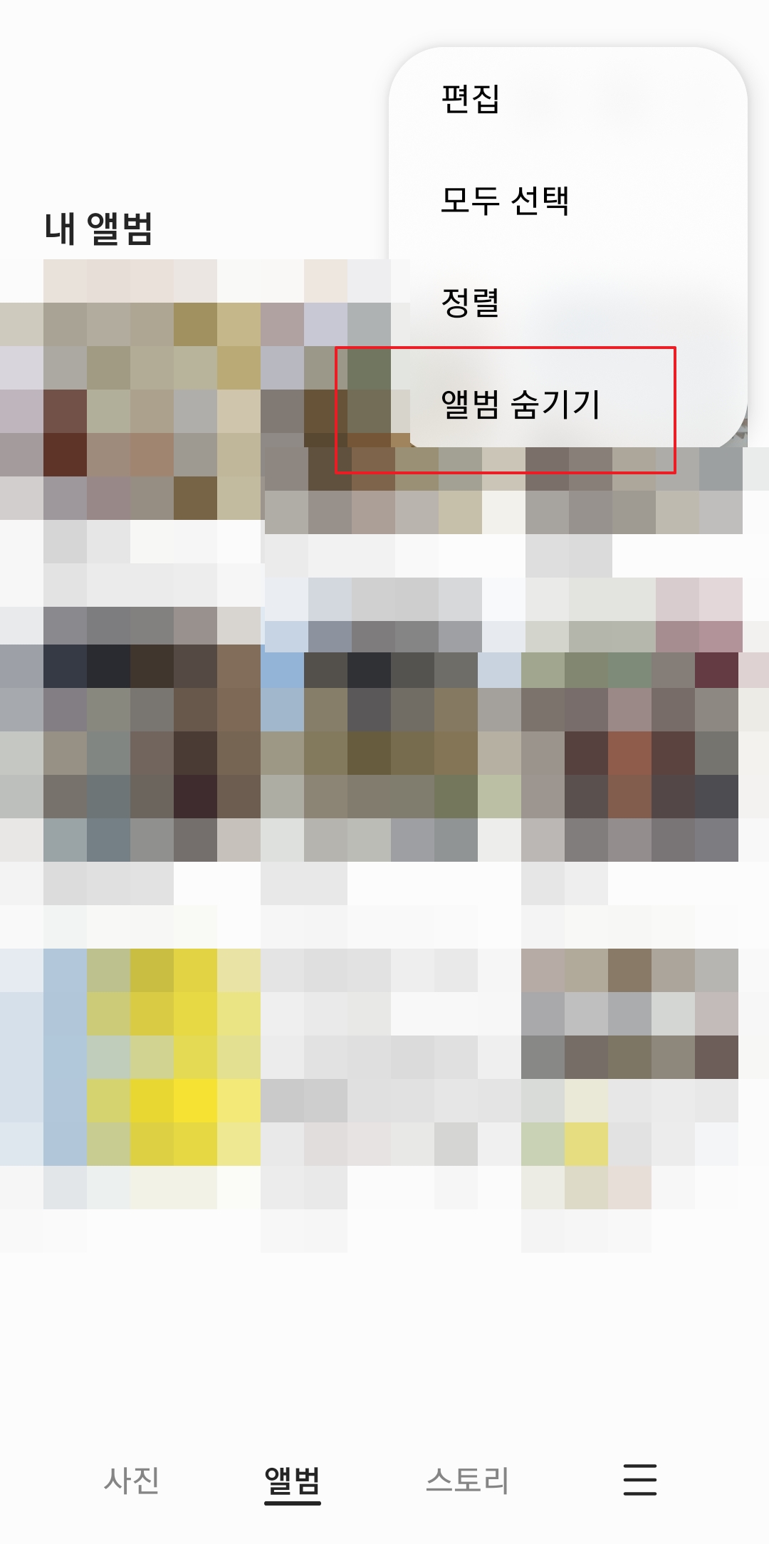 2. 점 세 개를 클릭하면 메뉴 창이 열리며, 여러 옵션이 표시됩니다. 여기에서 앨범 숨기기라는 항목을 찾아 선택합니다. 이 옵션을 통해 갤러리에 표시되는 특정 폴더를 숨길 수 있습니다.