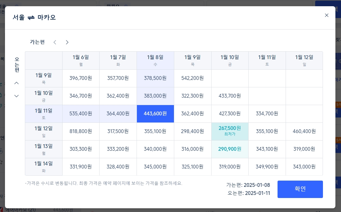 3. 캘린더를 통해 항공권 요금을 확인한 결과, 가는 날짜인 1월 8일의 최저가는 443,600원이었고, 오는 날짜인 1월 11일에도 동일한 가격이 표시되었습니다. 항공권 요금은 실시간으로 변동되며, 이 금액은 성인 기준입니다.
