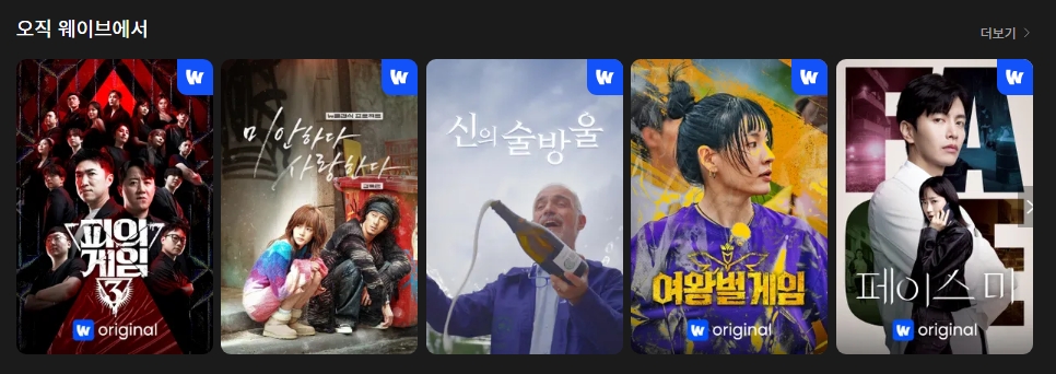 5. 오직 웨이브에서 섹션은 웨이브에서만 시청할 수 있는 독점 콘텐츠를 보여줍니다. 피의 게임 3, 미안하다 사랑한다, 신의 술방울, 여왕벌 게임, 페이스 미 등 웨이브 오리지널 작품들이 포함되어 있으며, 독점 콘텐츠를 선호하는 사용자들에게 매력적인 옵션을 제공합니다.