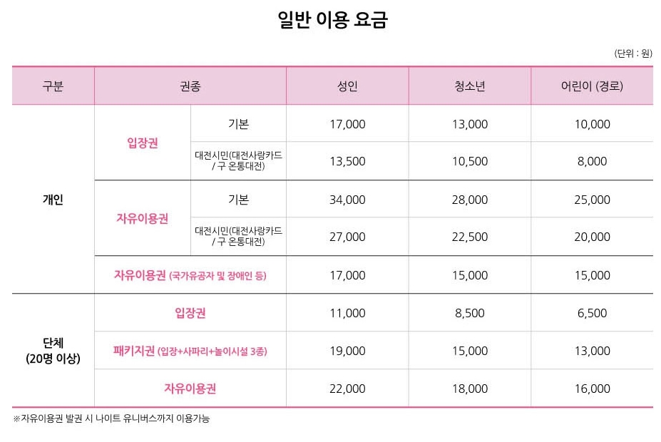 예를 들어 개인 성인의 자유이용권 기본 요금은 34,000원이며, 대전시민은 27,000원으로 할인됩니다.