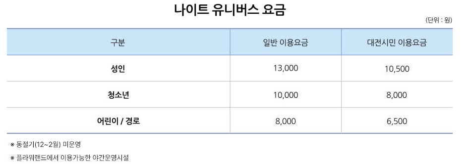 별도 코스인 나이트 유니버스는 입장 후 즐길 수 있는 야간 전용 어트랙션입니다. 일반 요금은 성인 13,000원·청소년 10,000원·어린이 8,000원이지만, 대전시민은 10,500원·8,000원·6,500원으로 할인됩니다.