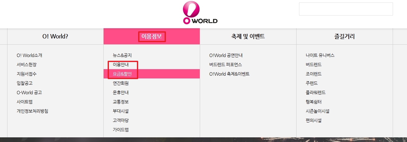 첫 번째 화면은 O!월드 홈페이지 상단 메뉴 구조를 보여줍니다. 여기에서 ‘이용정보’ 탭 안에 있는 요금&할인 메뉴를 클릭하면 요금표 페이지로 이동합니다.