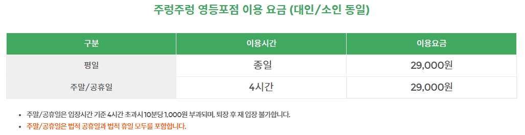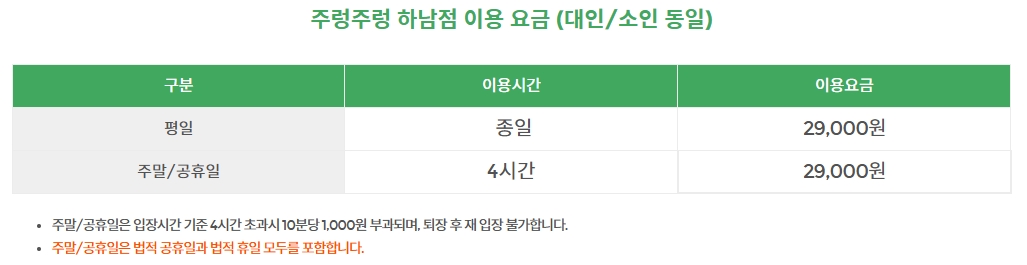하남점 역시 평일 종일과 주말 및 공휴일 4시간 이용 요금을 모두 29,000원으로 동일하게 책정했습니다. 주말 및 공휴일에는 법정 공휴일뿐만 아니라 법적 휴일도 모두 포함되어 휴일 일정에도 추가 요금 없이 이용할 수 있습니다.