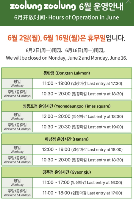 6월의 휴무일은 6월 2일(월)과 6월 16일(월)로 지정되어 있어 해당 날짜에는 방문이 불가능합니다. 각 지점별 영업시간을 확인하시면 방문 가능한 시간을 한눈에 파악할 수 있는데, 동탄점은 평일 11:00~19:00(입장 마감 17:30), 주말 및 공휴일 10:30~20:00(입장 마감 18:30)에 운영되고, 영등포점은 평일 12:00~20:00(입장 마감 18:30), 주말 및 공휴일 10:30~20:30(입장 마감 19:00)에 운영됩니다.