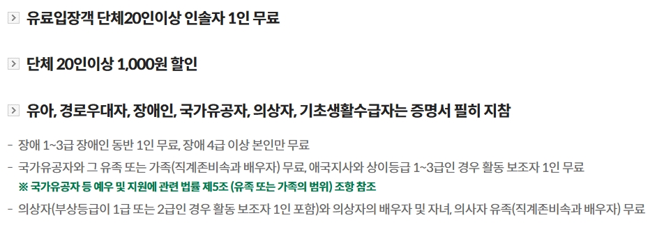세부 안내 영역에서는 단체 방문 및 사회적 배려 대상에 대한 추가 혜택을 제시합니다. 유료 입장객 단체 20인 이상 시 인솔자 1인은 무료 입장, 그리고 단체당 1,000원 할인 혜택이 제공됩니다. 사회적 배려 대상은 장애인·국가유공자·의상자·경로우대자 등으로, 관련 증빙 서류를 지참하면 무료 입장이 가능합니다.