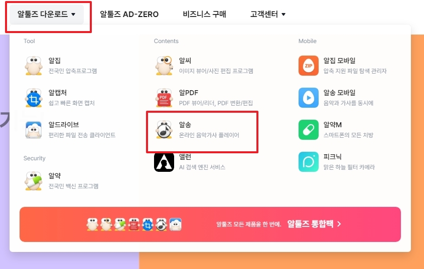 2. 홈페이지 상단 메뉴에서 알툴즈 다운로드 항목을 선택한 뒤, 해당 메뉴에서 알송을 찾아 클릭합니다. 알송은 음악 감상과 가사 제공을 함께 지원하는 프로그램으로, 다운로드 페이지로 이동하게 됩니다.