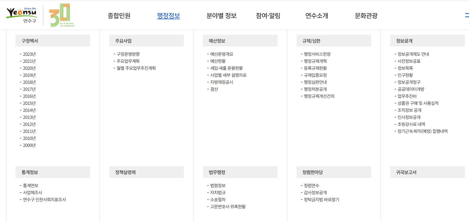 3. 행정정보 메뉴로 이동하면 구정백서, 주요사업, 예산현황 및 세입·세출 운용현황 등 연수구의 행정 운영에 대한 자료를 확인할 수 있습니다. 여기에는 통계정보, 정책실명제, 법무행정 등의 정보도 포함되어 있으며 구민들이 행정 절차를 쉽게 이해할 수 있도록 돕습니다.