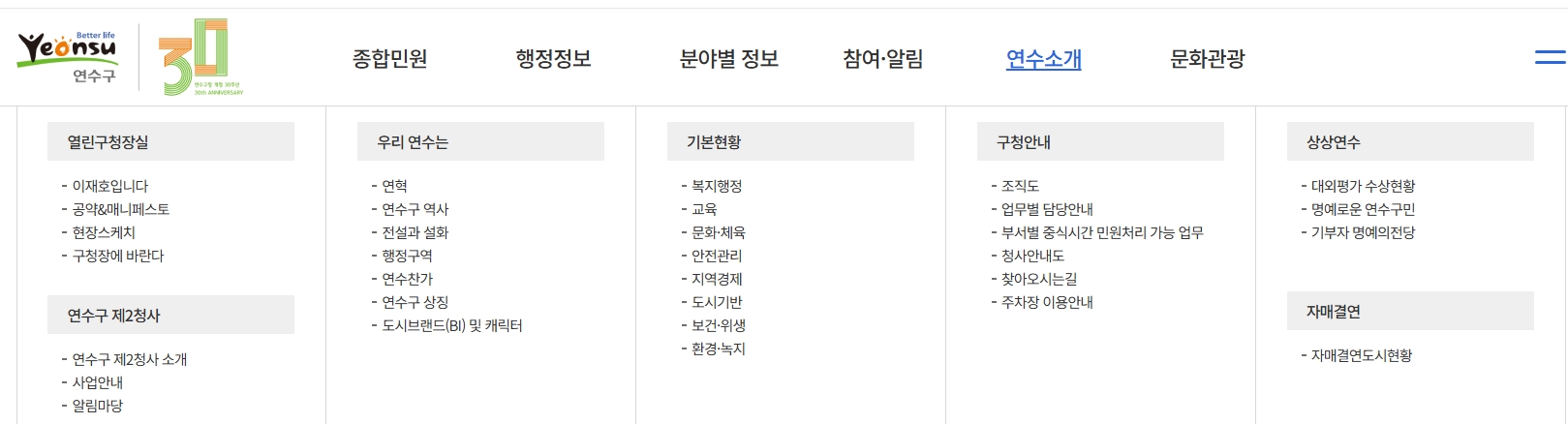 6. 연수소개 메뉴에서는 연수구의 역사와 기본 현황, 행정구역, 구청 안내 등을 볼 수 있습니다. 또한 구청의 조직도, 업무별 담당 안내, 청사 안내도, 찾아오시는 길 등의 정보를 통해 구청 방문과 행정 처리에 대한 편의를 제공합니다.