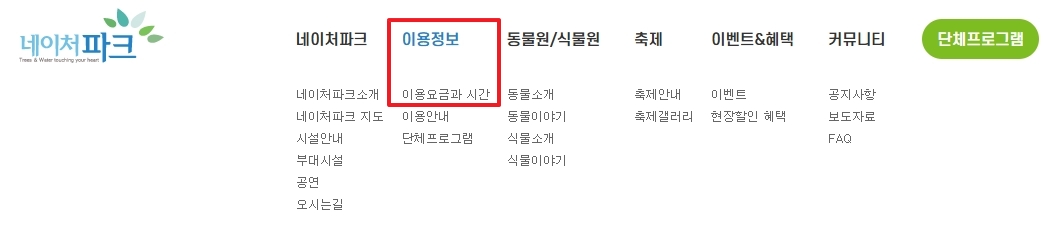 사이트 상단에 위치한 메뉴는 방문객들의 편의를 고려해 명확히 구성되어 있습니다. 네이처파크 로고 오른쪽에는 이용정보 메뉴가 있고, 그 하위에 '이용요금과 시간'과 '이용안내' 항목이 배치되어 있습니다.