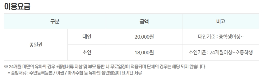 종일권 가격은 대인 기준 20,000원이며 중학생 이상이 해당합니다. 소인은 24개월 이상부터 초등학생까지로 18,000원이 적용됩니다.