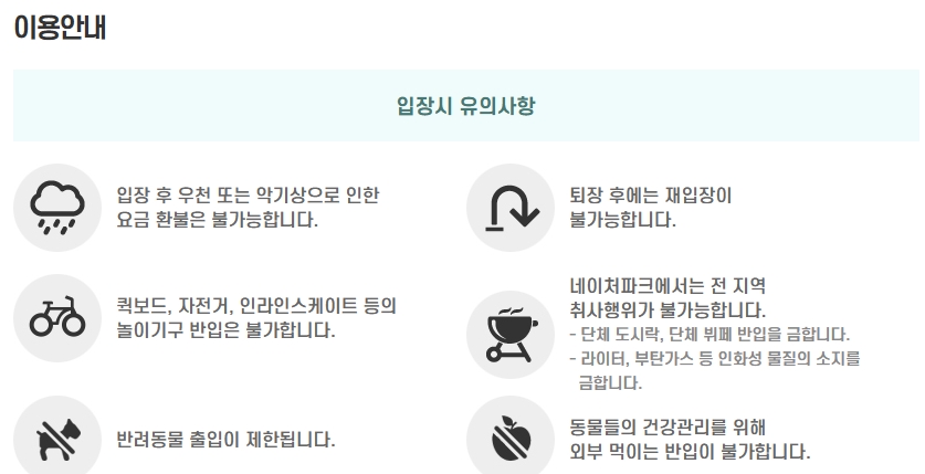 입장 후에는 우천 혹은 악기상으로 인한 요금 환불 불가능하며, 퇴장 시 재입장은 허용되지 않습니다. 퀵보드, 자전거, 인라인스케이트 등의 놀이기구 반입은 모두 금지됩니다.