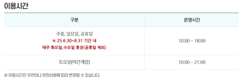 운영시간은 주중, 일요일, 공휴일에 오전 10시부터 오후 6시까지입니다. 단 빅 이벤트 기간인 25년 6월 30일부터 8월 31일까지 매주 화요일과 수요일에는 휴장하나 공휴일이 겹칠 경우 예외적으로 개장합니다.