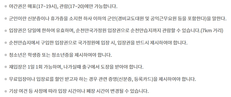 무료 또는 할인 대상(군인·청소년·순천시민 등)은 신분증이나 등록카드를 제시해야 하며 재입장은 출구 도장 확인 후 1회만 가능합니다.