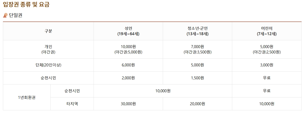 단일권 요금은 개인, 단체, 순천시민 등으로 구분되며 성인은 개인 10,000원, 단체(20인 이상)는 6,000원입니다.