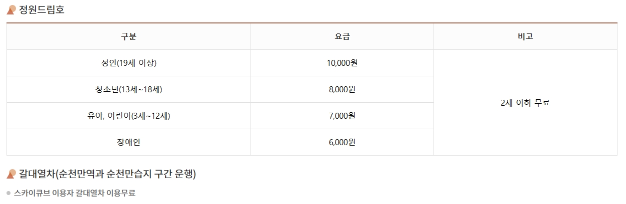 요금은 일반권(성인·청소년) 왕복 8,000원·편도 6,000원, 순천시민 할인 권종도 제공되며 유아(만 6세 이하)는 무료입니다.