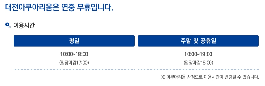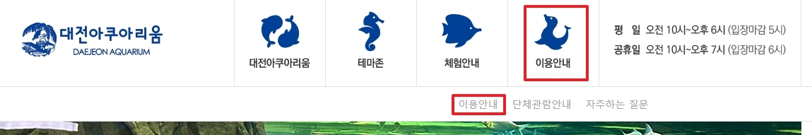 시작부터 반겨주는 대전아쿠아리움 로고 덕분에 어른·아이 구분 없이 설레는 마음으로 페이지를 열게 됩니다. 상단 메뉴 중 이용안내 아이콘을 누르면 가장 궁금한 정보를 한 번에 모아볼 수 있어요.